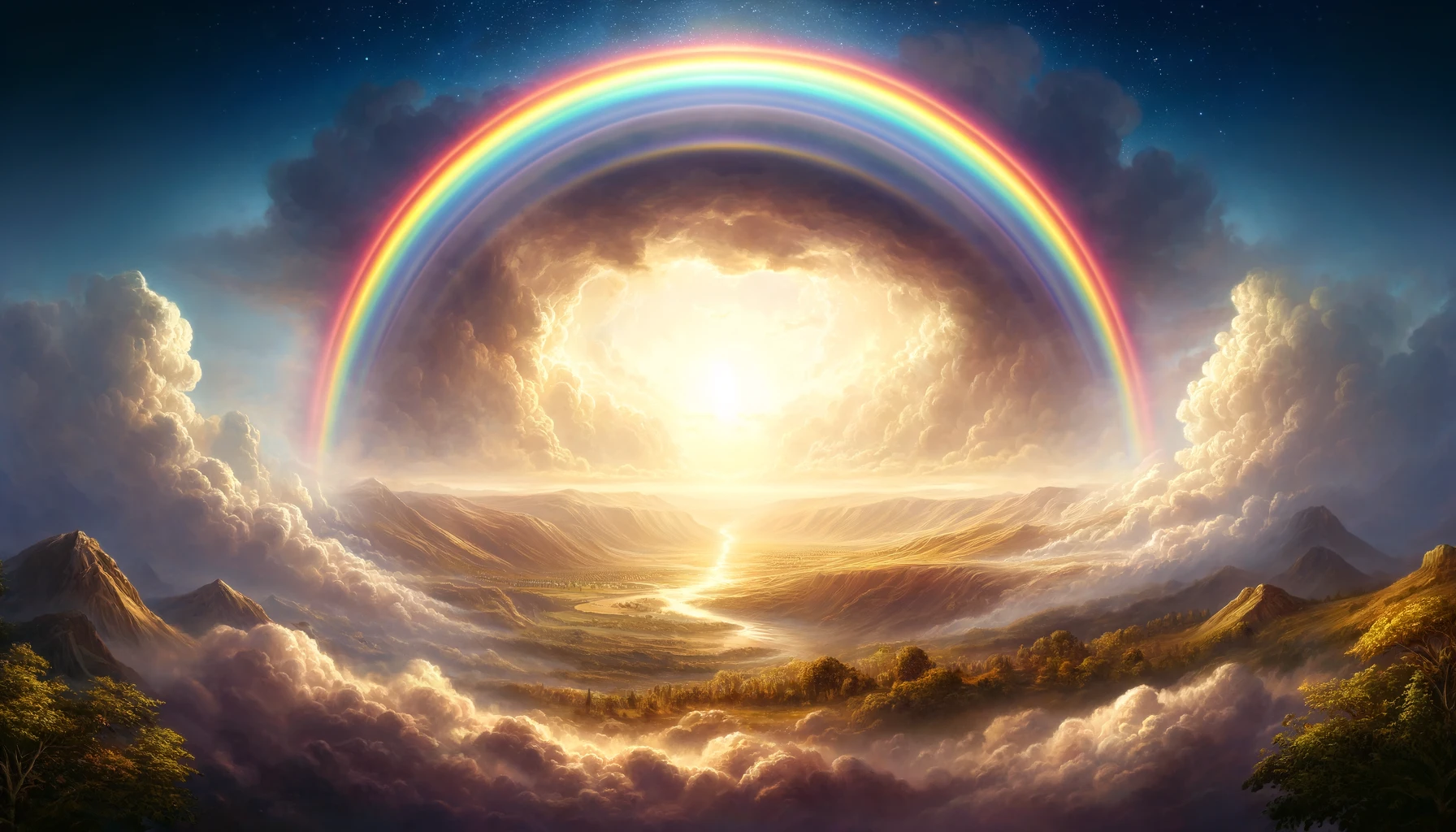Reflection: The rainbow’s appearance in the clouds around the divine figure in Ezekiel’s vision reinforces the covenantal sign and the splendor of the “throne of God,” depicted through natural phenomena. The rainbow, set against the sky, acts as a bridge between God and humanity, symbolizing peace and the enduring promise of divine presence.
