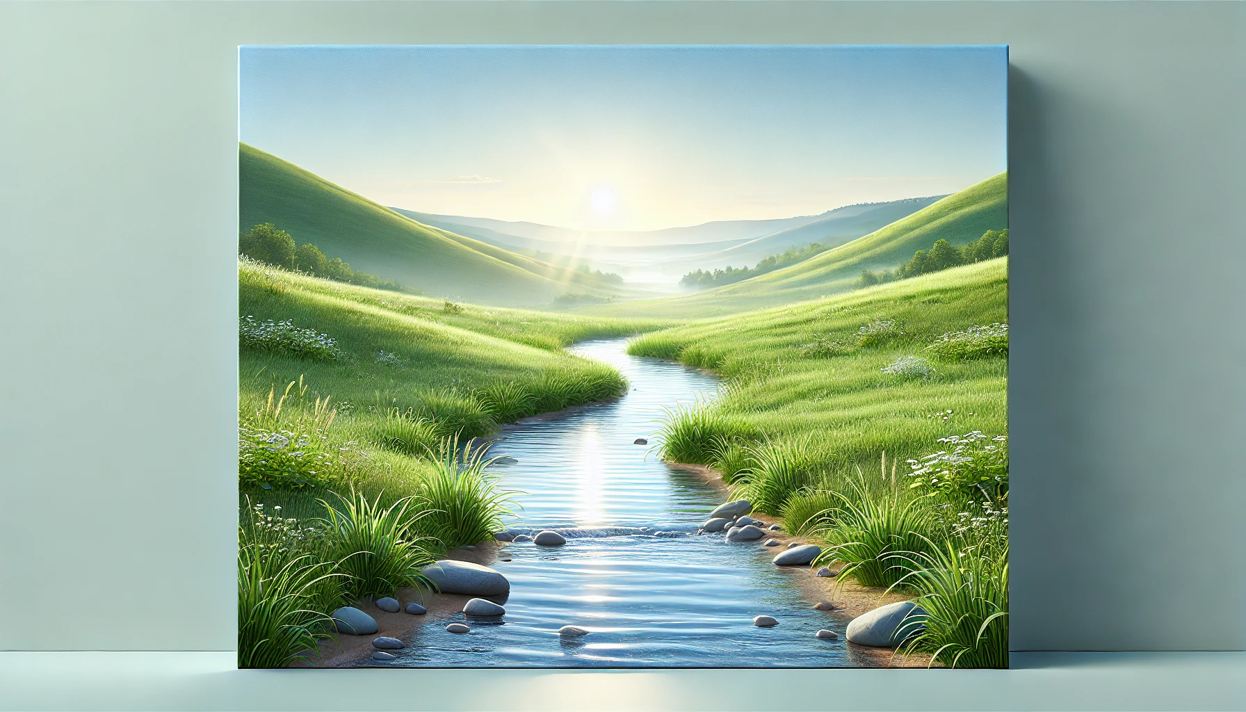 A peaceful meadow with a gentle stream flowing through it, surrounded by soft hills under a clear blue sky.