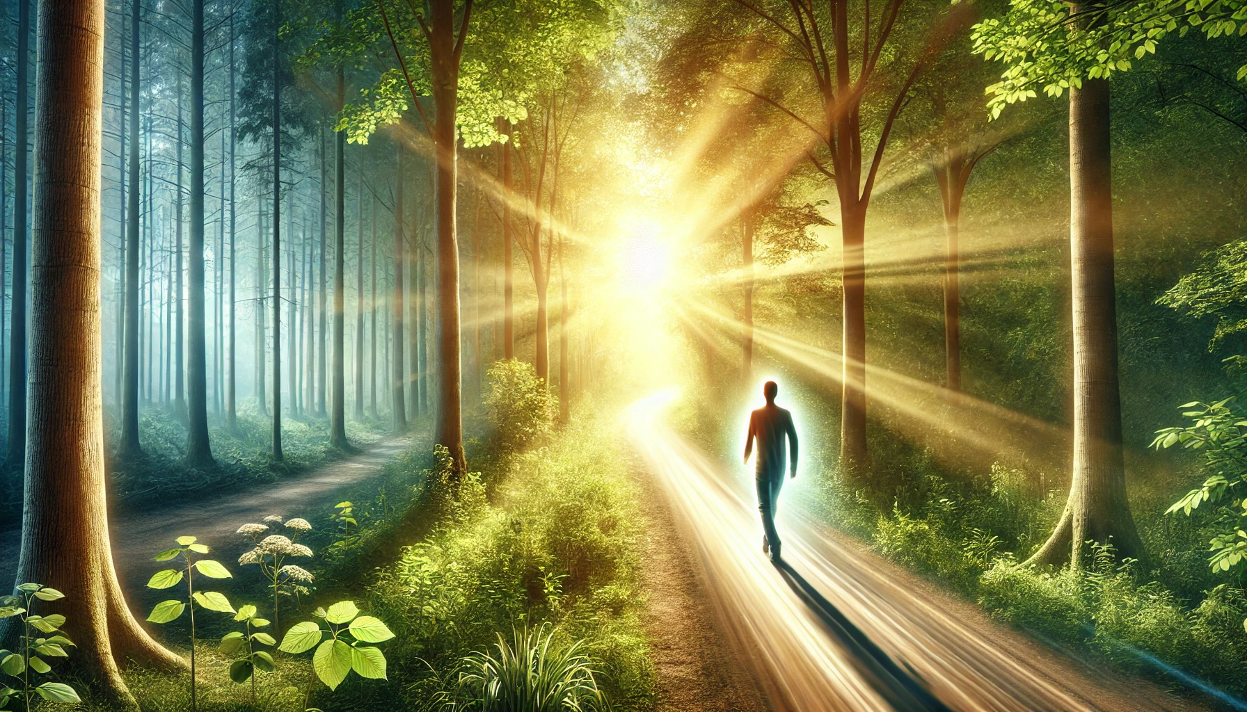 A person walking along a serene forest path with sunlight filtering through the trees.