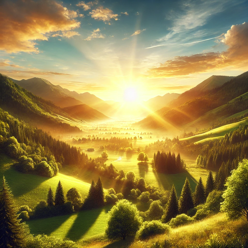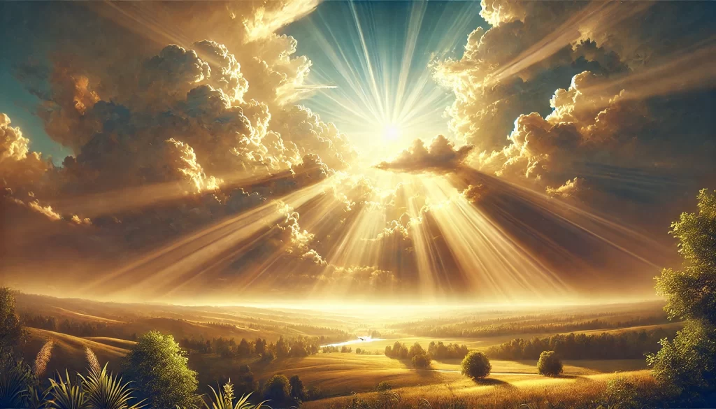The sun shining through the clouds over a valley.