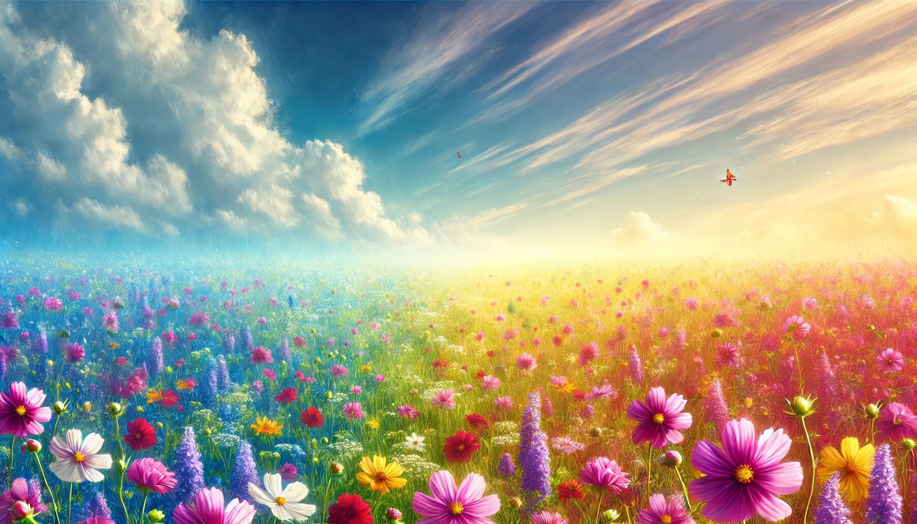 A vibrant field of wildflowers stretching to the horizon under a clear blue sky.