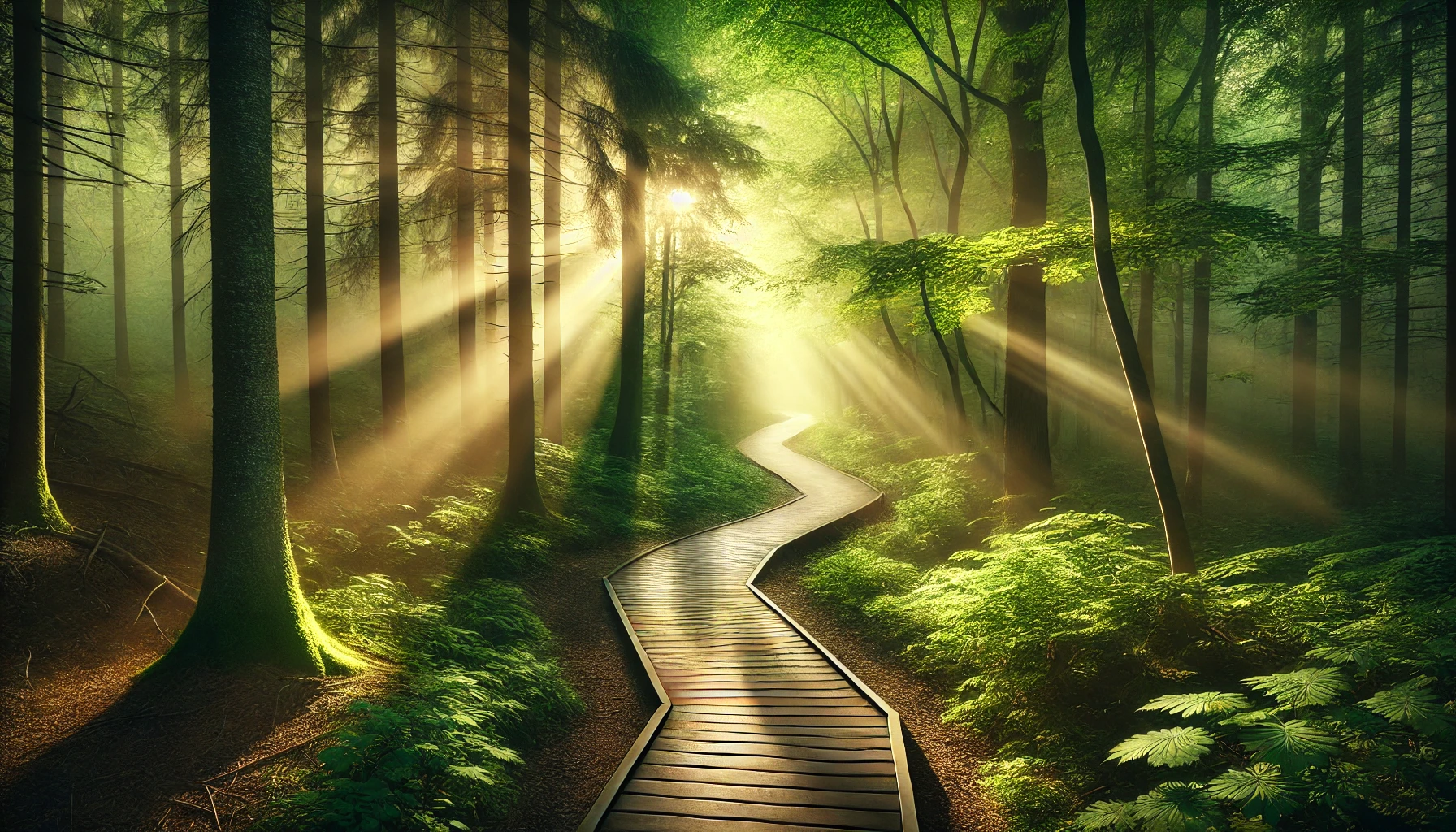 A winding forest path illuminated by rays of sunlight breaking through dense trees.