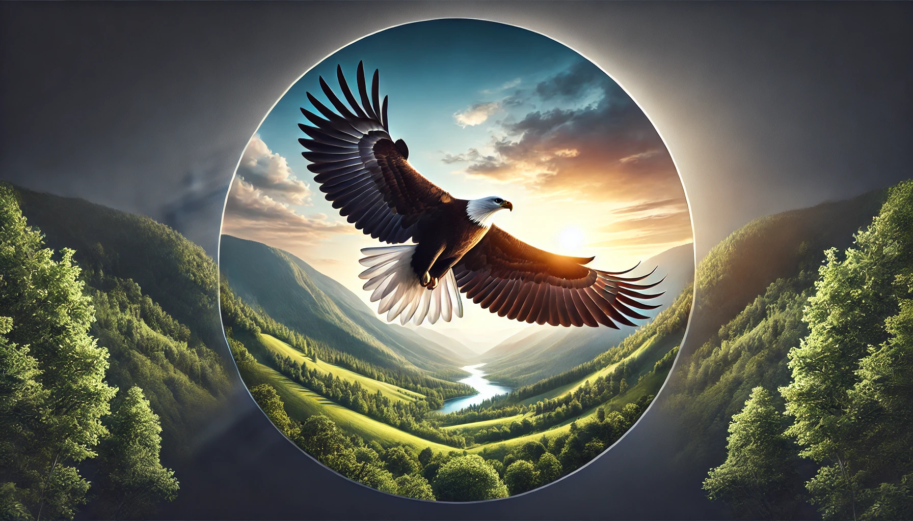 An eagle soaring high in the sky above a lush valley.