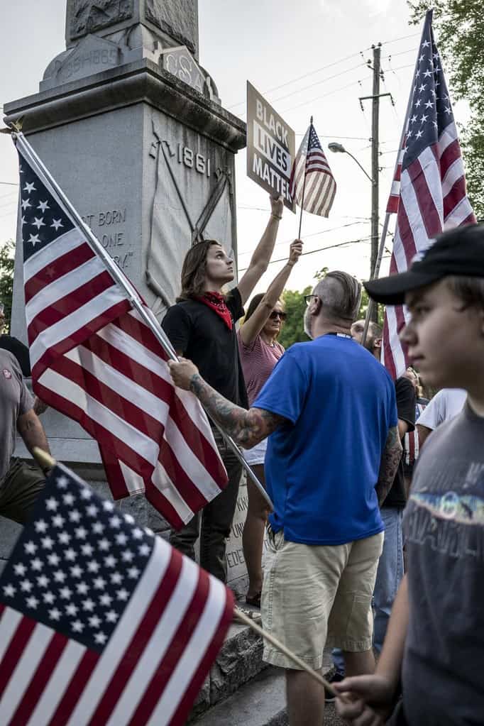Flag-waving pro-monument protesters crossed the street to walk among the demonstrators during their 8:46 moment of silence for George Floyd. Photo by Tammy Rockwell