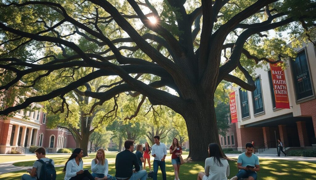 Looking into college options means weighing Christian schools against secular ones. This decision affects a student’s academic and spiritual journey. A Pew Research Center study found that 76% of college students believe in God. This highlights faith’s role. Yet, the academic quality and unique campus atmosphere of Christian colleges are also key in choosing a school.