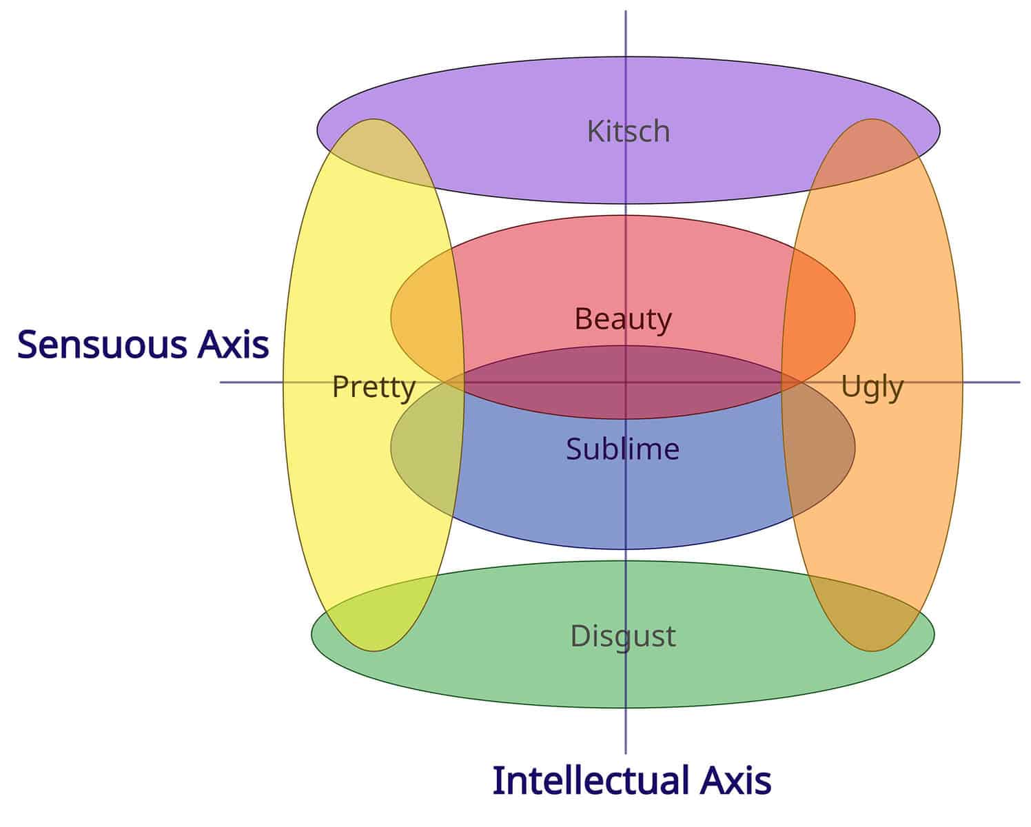 One problem with using a Venn diagram to illustrate this theory is that it inherently implies proportion. When one looks at the diagram the natural assumption is that the six categories are largely separate but intersect in important ways. It must be understood that the diagram illustrates the concept of the intersection but does not represent the proportion. In all likelihood, there exists a proportionally small amount of beauty that is not intersecting with pretty, ugly, or sublime. The diagram is meant to illustrate only the structure of the theory and not the proportions in which the theory actually manifests. Key to understanding the diagram is the two-axis structure. Pretty and ugly fall along the Sensuous Axis because both those categories are reliant upon purely sensory input. On the other hand, beauty, sublime, kitsch, and disgust fall upon the Intellectual Axis as they rely on cognitive judgments.