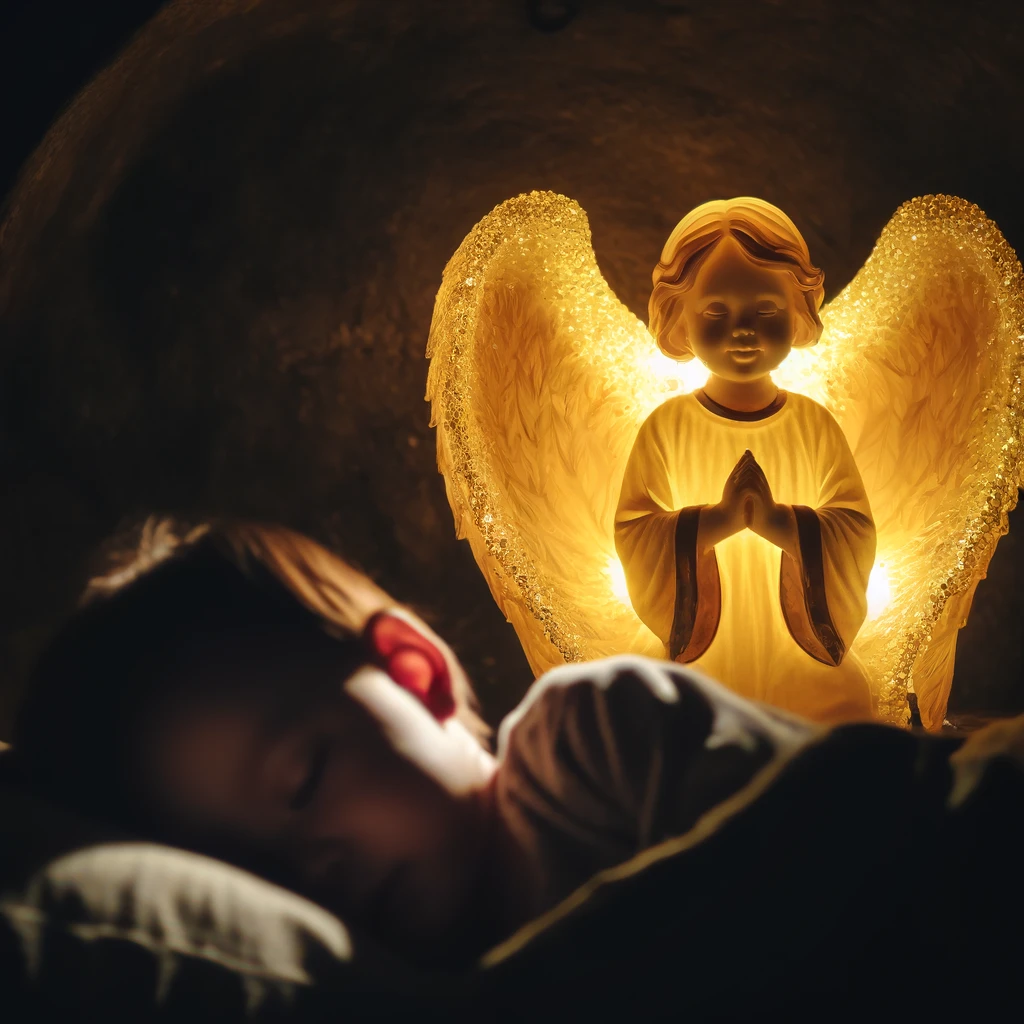 A guardian angel with outstretched wings watching over a sleeping child, glowing softly in a dimly lit room.
