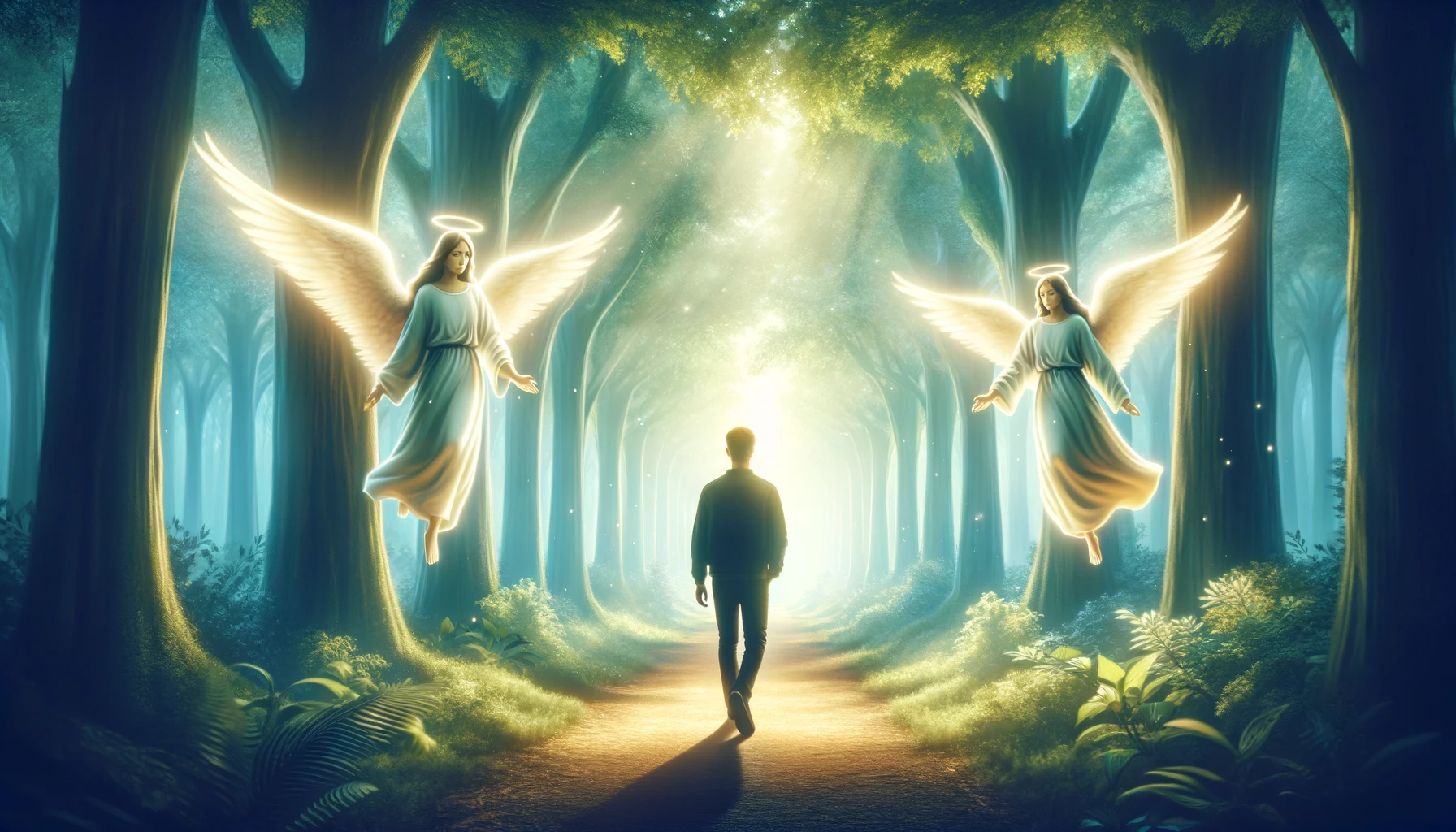A serene scene of angels watching over a person walking on a path through a lush, peaceful forest.