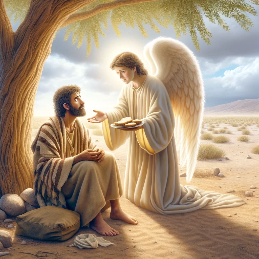 “Then he lay down under the broom tree and fell asleep. Suddenly an angel touched him and said to him, โ€˜Get up and eat.โ€™ He looked, and there at his head was a cake baked on hot stones, and a jar of water. He ate and drank, and lay down again. The angel of the Lord came a second time, touched him, and said, โ€˜Get up and eat, otherwise the journey will be too much for you.โ€™”