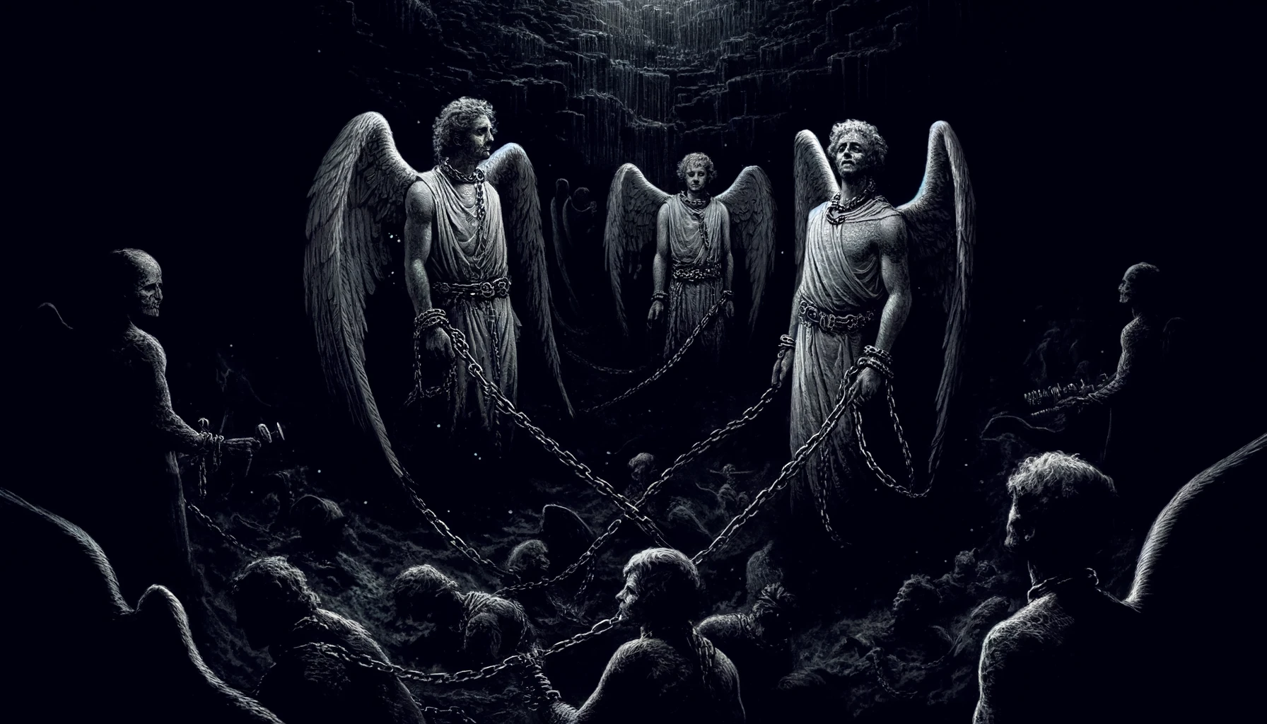 Fallen angels in eternal chains, depicted in a dark, shadowy abyss.