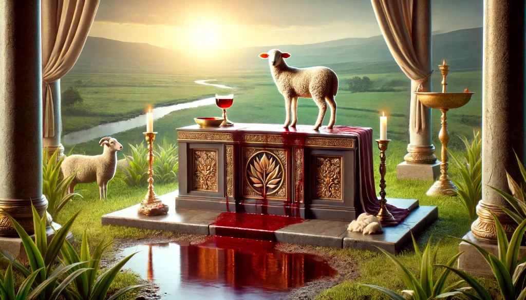 A ceremonial altar with a lamb and a pool of blood.