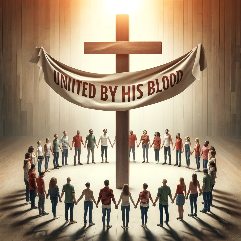 A diverse group of people holding hands in a circle under a banner that reads 'United by His Blood.'