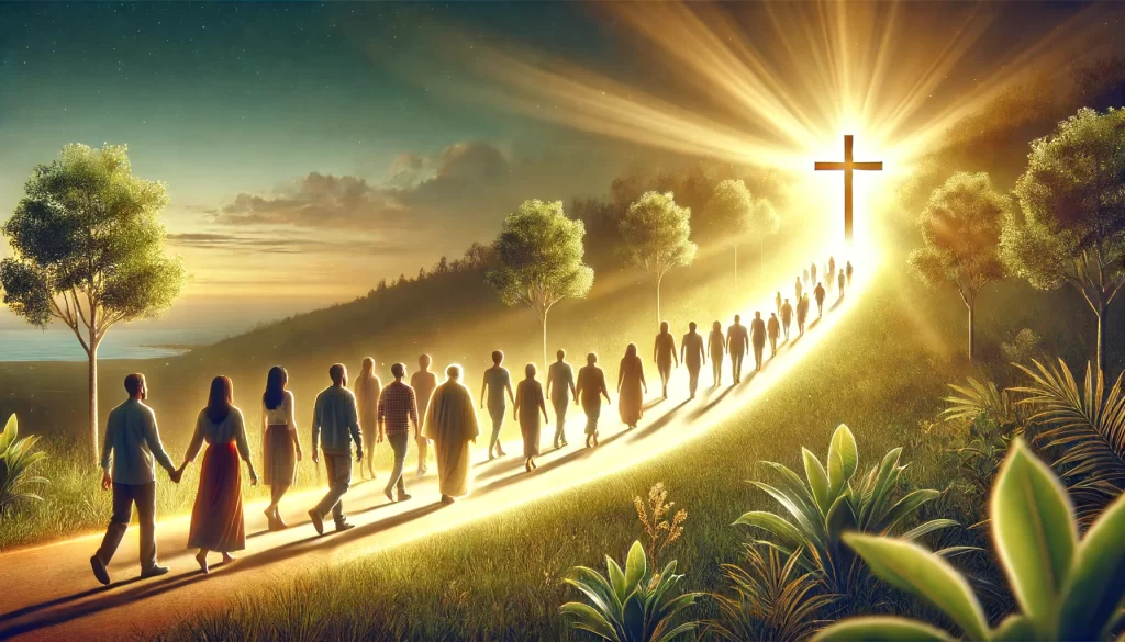 A group of diverse people walking on a bright path illuminated by a warm, golden light.