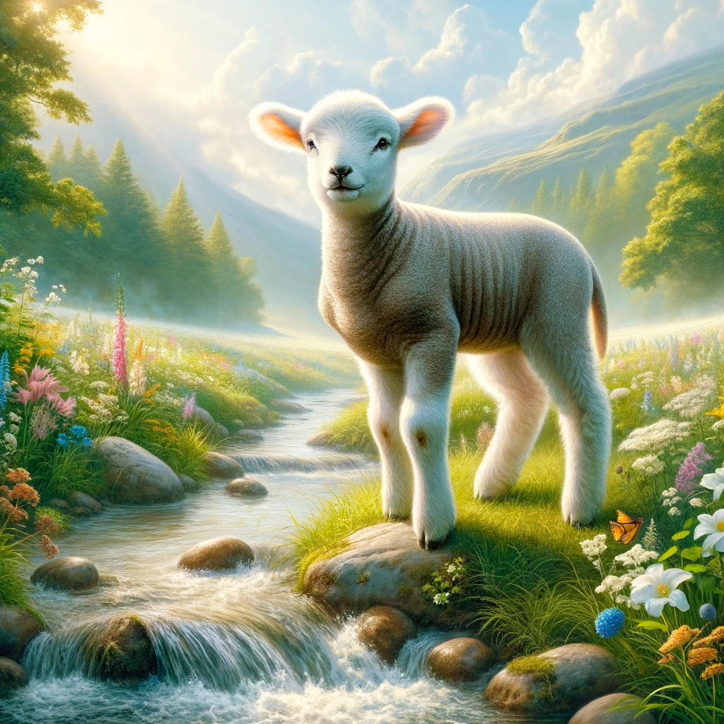 A lamb standing by a flowing stream.