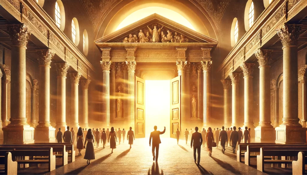 An ancient, grand sanctuary with an open door, bathed in warm, divine light.