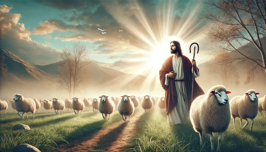 Jesus as a shepherd, surrounded by sheep in a serene pastoral setting.