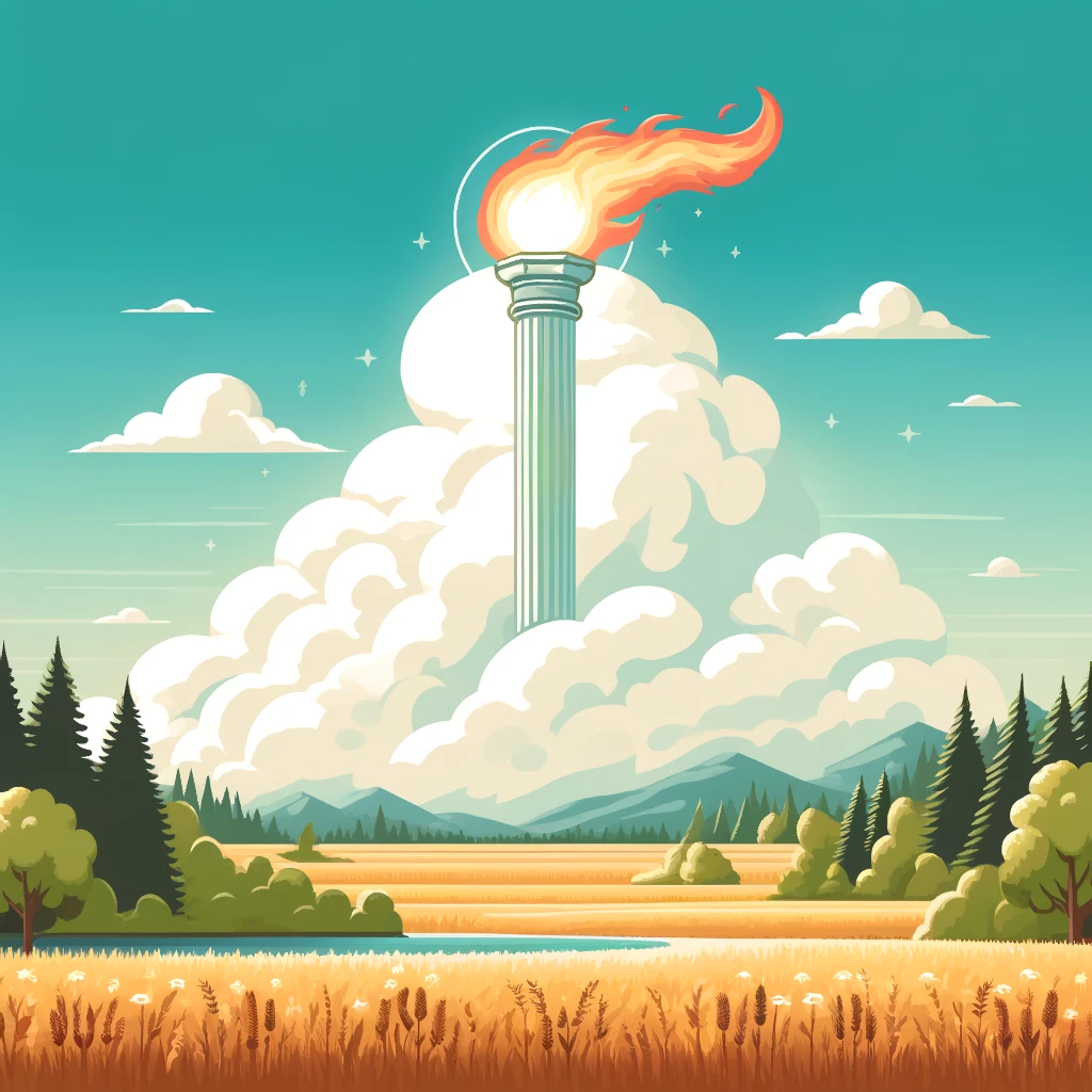 A peaceful landscape with a pillar of cloud and fire in the background.