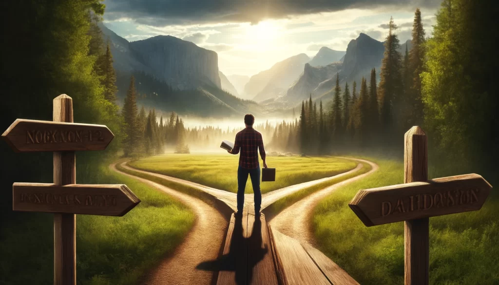 A person standing at a crossroads in a scenic landscape, with mountains and trees in the background.
