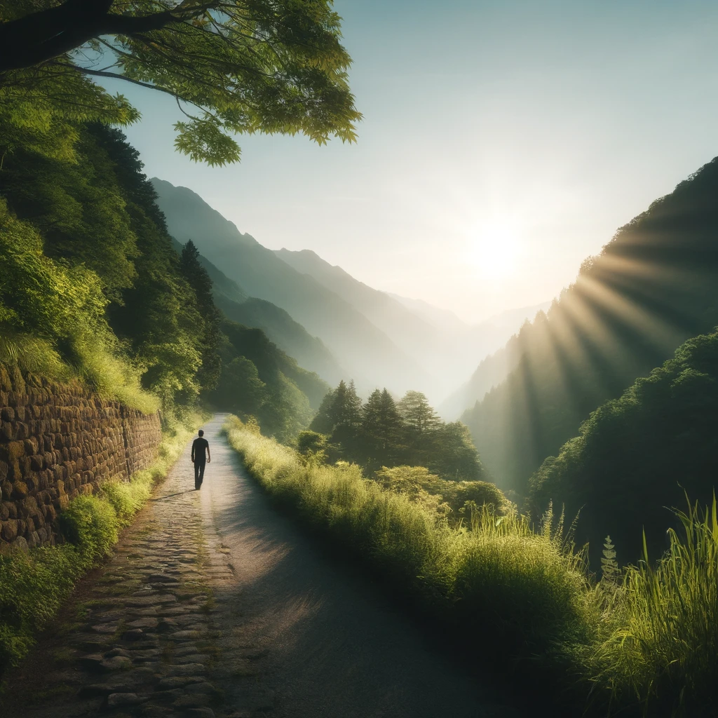 A serene mountain path with a traveler walking under a bright light that illuminates the path.