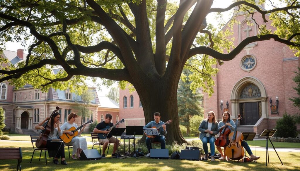Also, places like Abilene Christian University and Wheaton College give tailored courses. These focus on music theory, performance, and teaching music in a Christian setting. They make sure students are ready to succeed in music careers and keep their faith. Oral Roberts University, Union University, and Harding University add to this rich field of Christian college music studies. They have lively programs and teachers devoted to helping students grow.