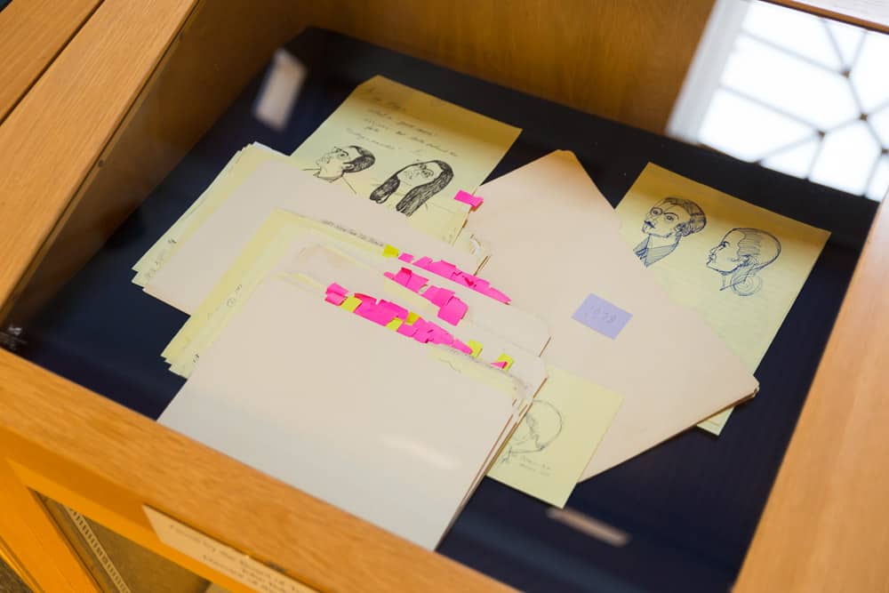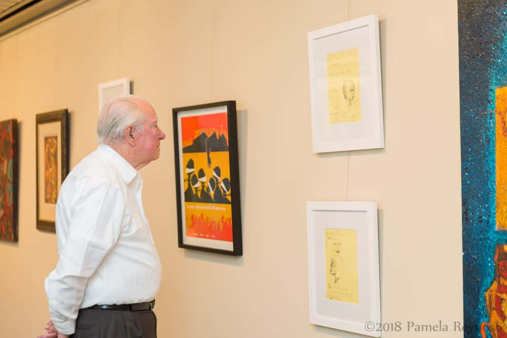 One challenge in organizing this exhibition was how to tie my father’s drawings from his days on the Supreme Court with the themes of Law, Religion, and Social Justice. Law was simple as these drawings were executed on his court notes. Social Justice, likewise, with its close connection to legal activism was an easy connection.