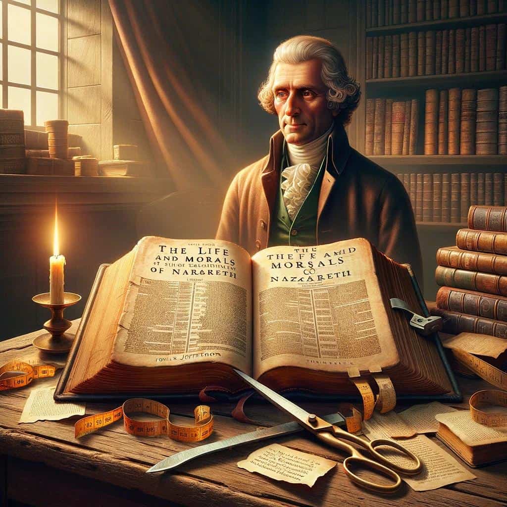 As an example of Jefferson’s non-Christianness, as well as ammunition for us kicking him out, I offer The Life and Morals of Jesus of Nazareth, known as the Jefferson Bible, which was something Jefferson completed in 1820 by cutting several passages of the New Testament and pasting together the remainder.