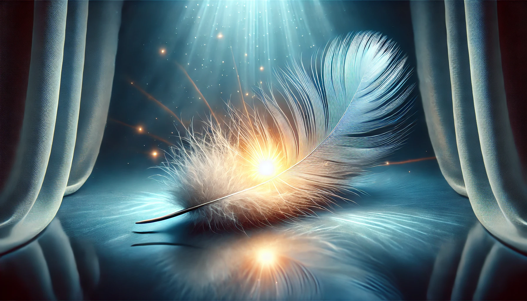 A serene image of a large feather softly cradling a glowing light, representing divine protection.