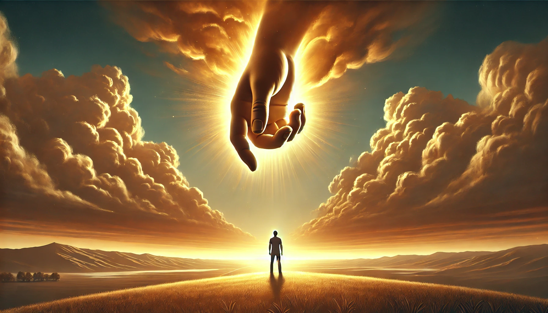 A symbolic image of a strong hand reaching down from the clouds, glowing with golden light.