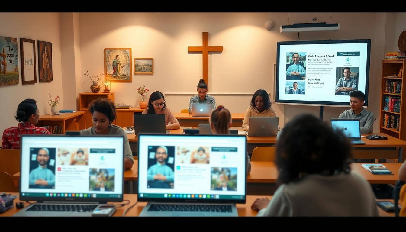 In virtual learning, biblical teachings virtual classes mix ancient wisdom with today’s issues. Students dive deep into biblical stories. They learn virtues that matter now.