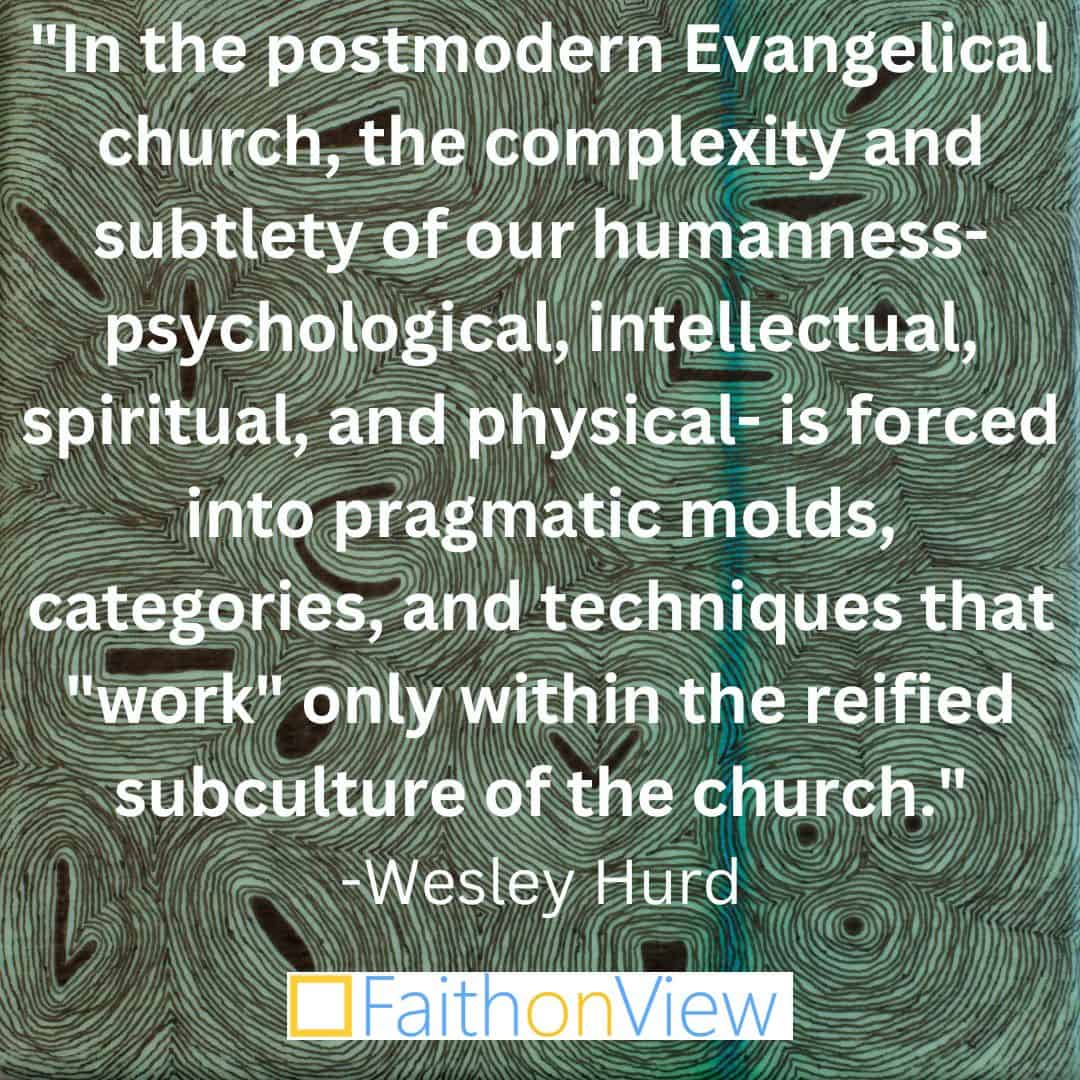 "In the postmodern Evangelical church, the complexity and subtlety of our humanness-psychological, intellectual, spiritual, and physical-is forced into pragmatic molds, categories, and techniques that "work" only within the reified subculture of the church."