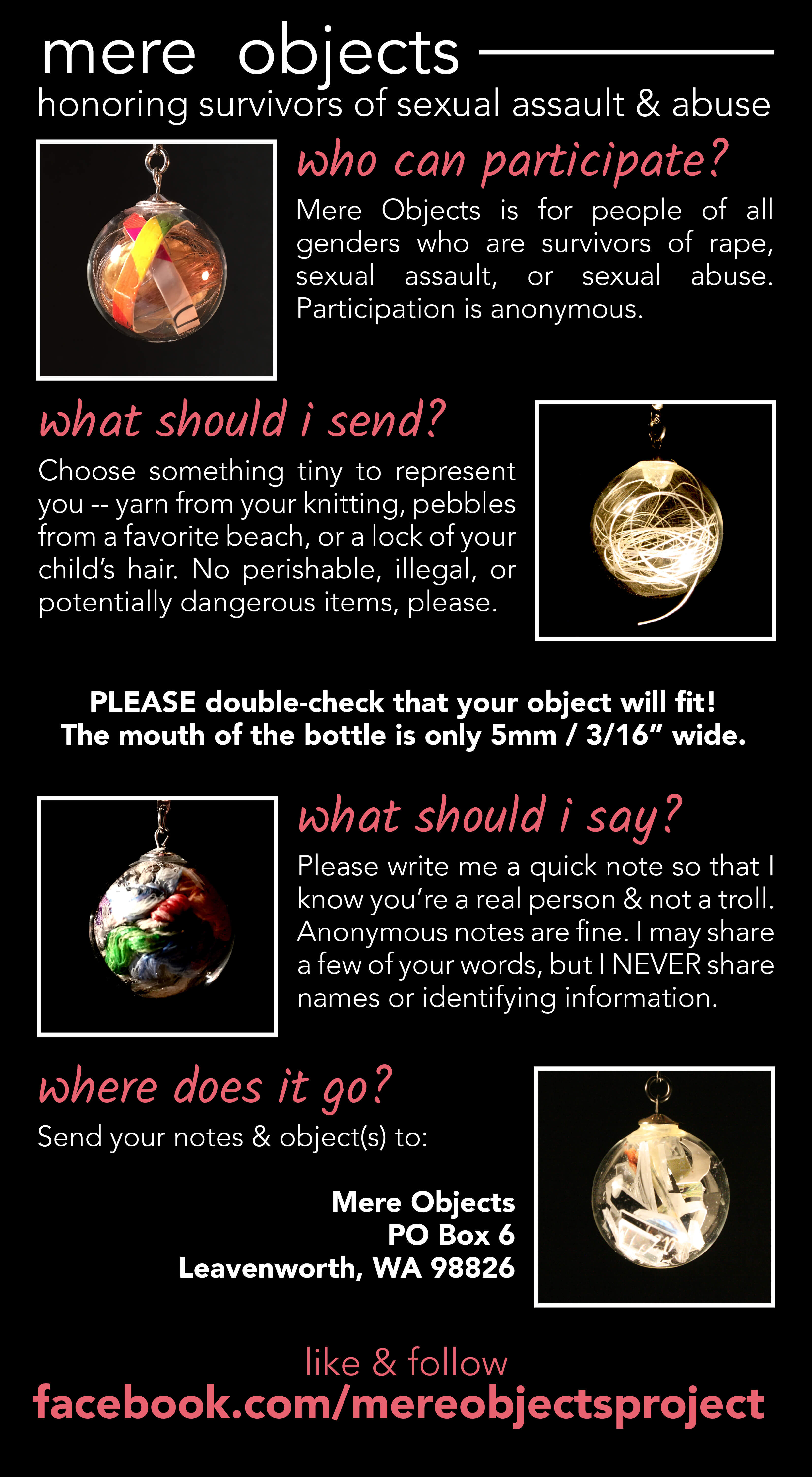 The public face of Mere Objects was launched on November 15, just a week after the election. As a concept, it’s very simple: survivors are invited to send one or more tiny objects to represent themselves. The objects are placed in a small bottle – a portrait of a survivor – and added to the ever-growing collection. The goal is to build a great, glittering mass of bottles: a “cloud of witnesses” testifying that survivors are not alone, that violation does not define us, and that hope and healing are possible.