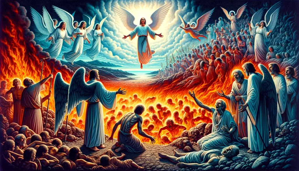 This apocalyptic vision from Revelation depicts the eternal torment awaiting those aligning themselves with evil forces, such as those that embody the anti-Christ. The vivid imagery of fire, sulfur, and unending smoke highlights the severity of God’s judgment on the wicked. It serves as a powerful warning against idolatry and allegiance to evil powers. For believers, it underscores the importance of remaining faithful to God and resisting the temptations and pressures of the world, knowing that ultimate justice will prevail.