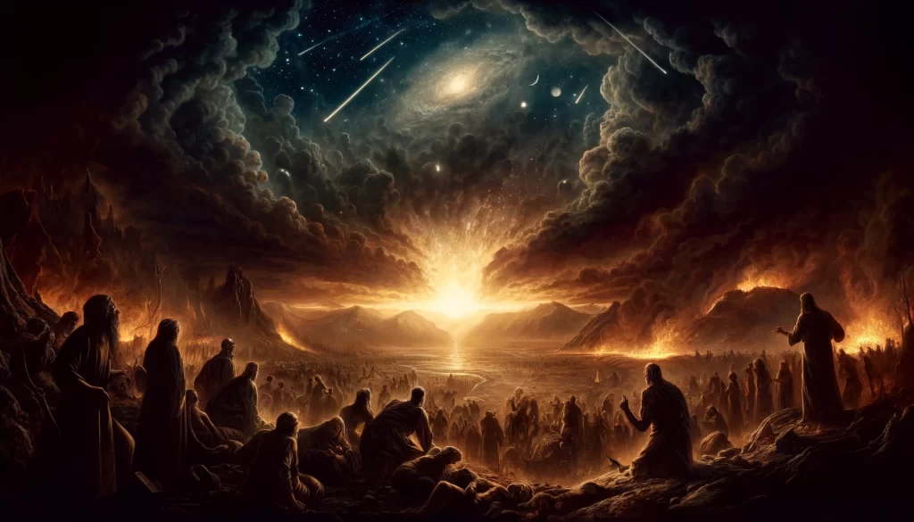 The opening of the sixth seal in Revelation describes a series of catastrophic events, symbolizing upheaval during the end times. The great earthquake, darkened sun, blood-red moon, and falling stars create cosmic chaos. These terrifying signs warn of the impending day of the Lord and the necessity of being spiritually prepared. They remind us of the power and sovereignty of God over all creation and the ultimate culmination of His divine plan.