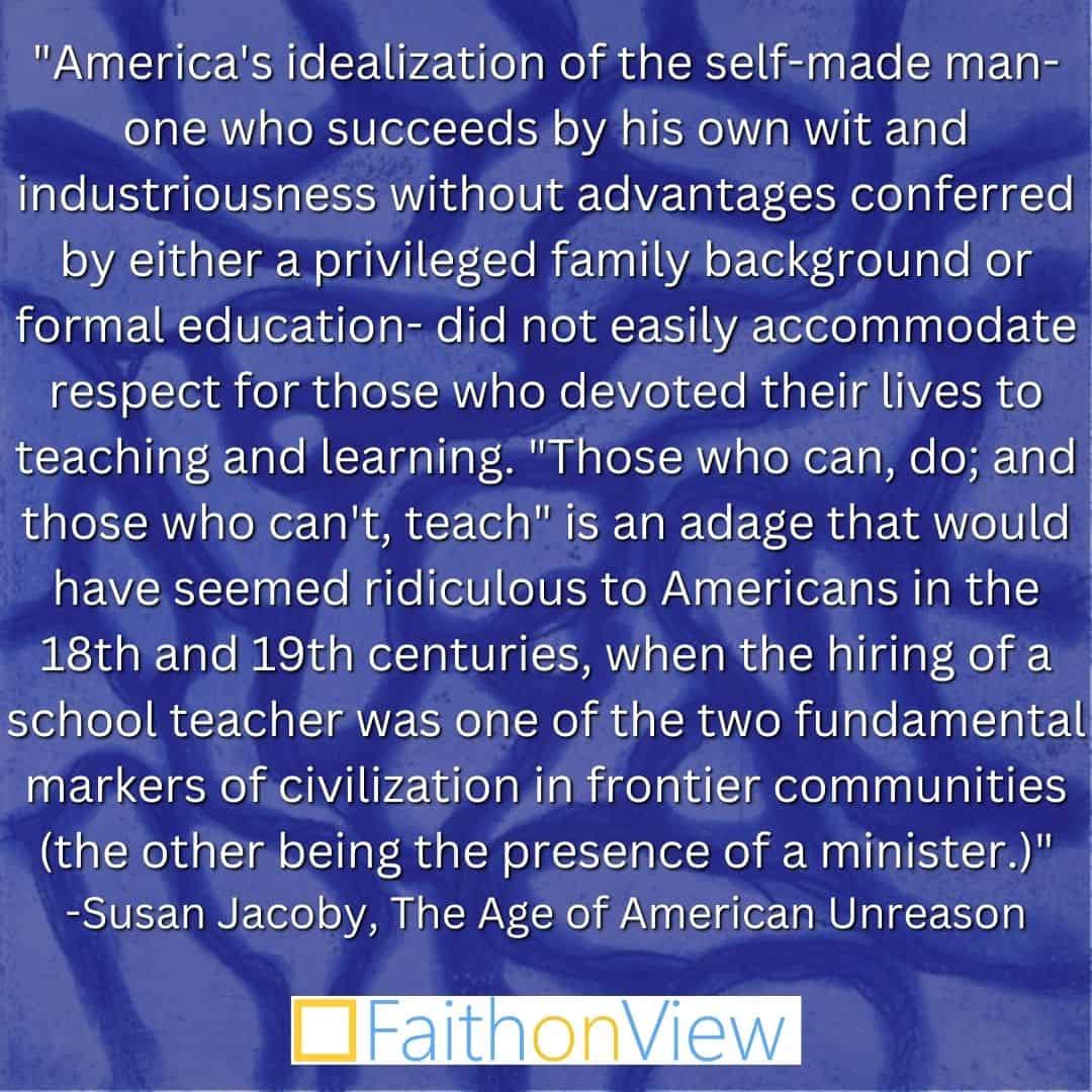 "America's idealization of the self-made man - one who succeeds by his own wit and industriousness without advantages concerned by either a privileged family background or formal education - did not easily accommodate respect for those who devoted their lives to teaching and learning. 'Those who can, do; and those who can't, teach' is an adage that would have seemed ridiculous to Americans in the 18th and 19th centuries, when the hiring of a school teacher was one of the two fundamental markers of civilization in frontier communities (the other being the presence of a minister.)"
