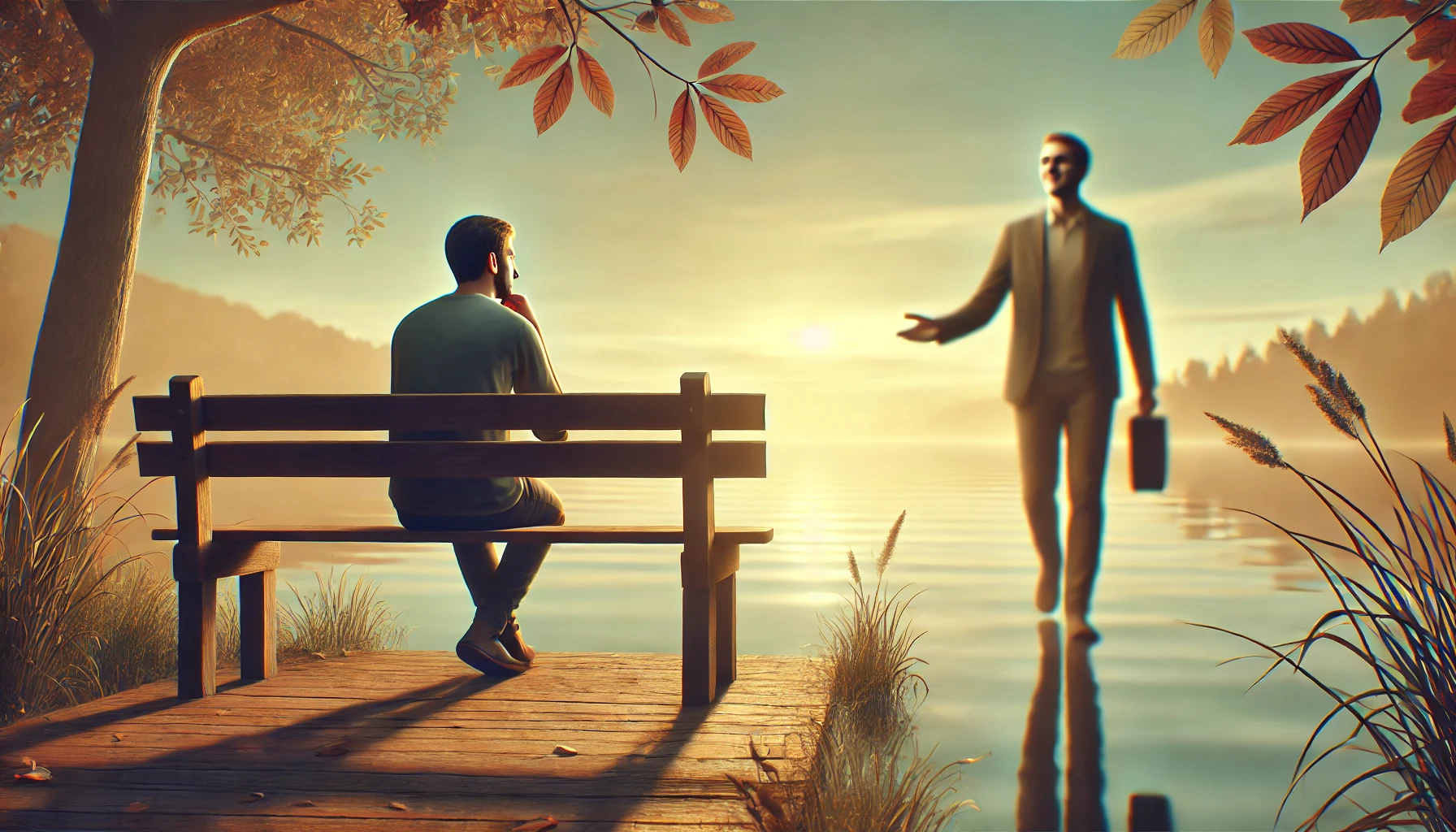 A calm, reflective scene where one individual is sitting alone on a wooden bench by a lake.