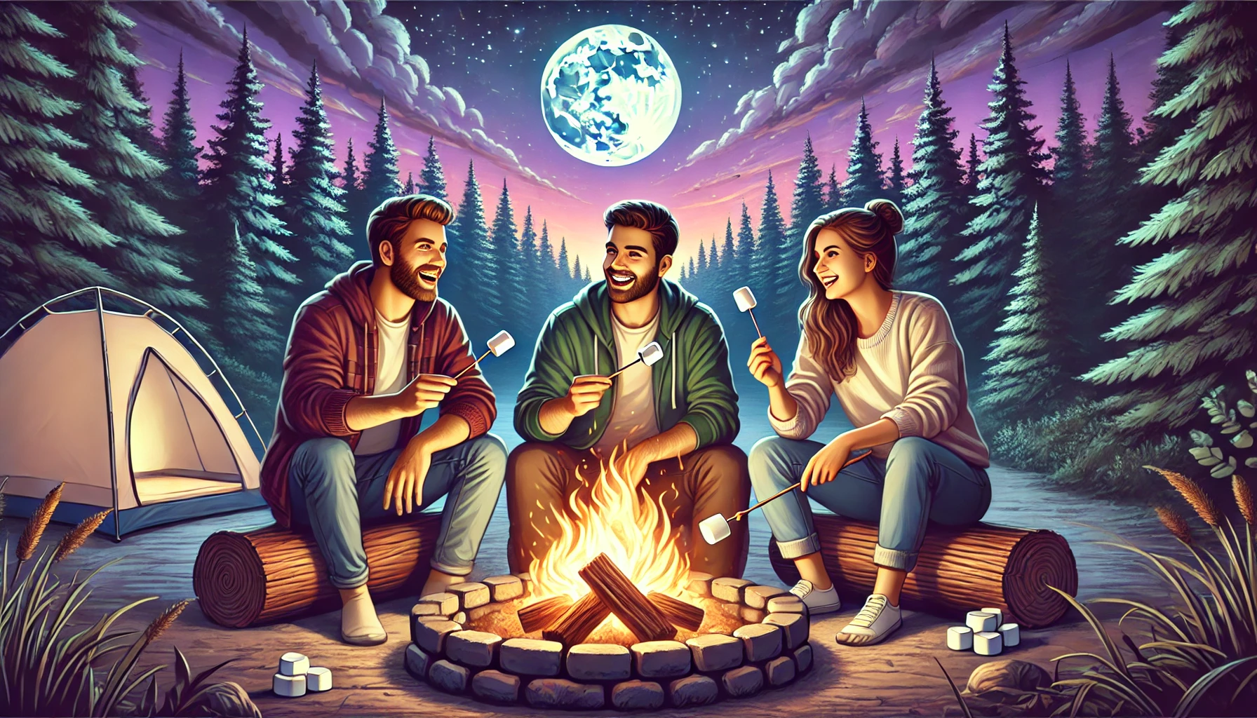 Three close friends sitting around a cozy fire pit during a calm evening. They are roasting marshmallows,