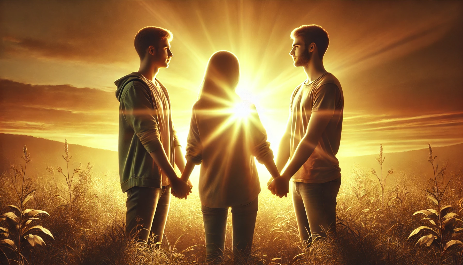 Three friends standing close together in a field with a glowing sunset behind them.