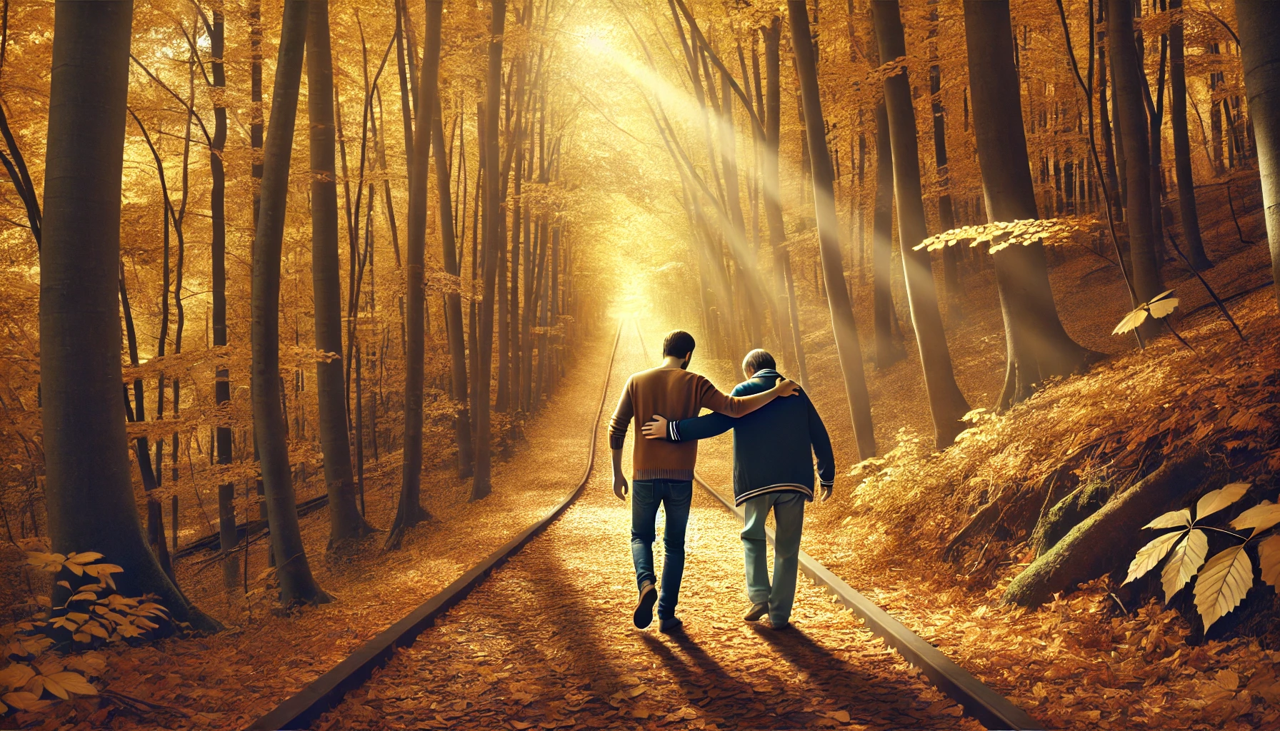 Two friends walking side by side along a forest trail in autumn.