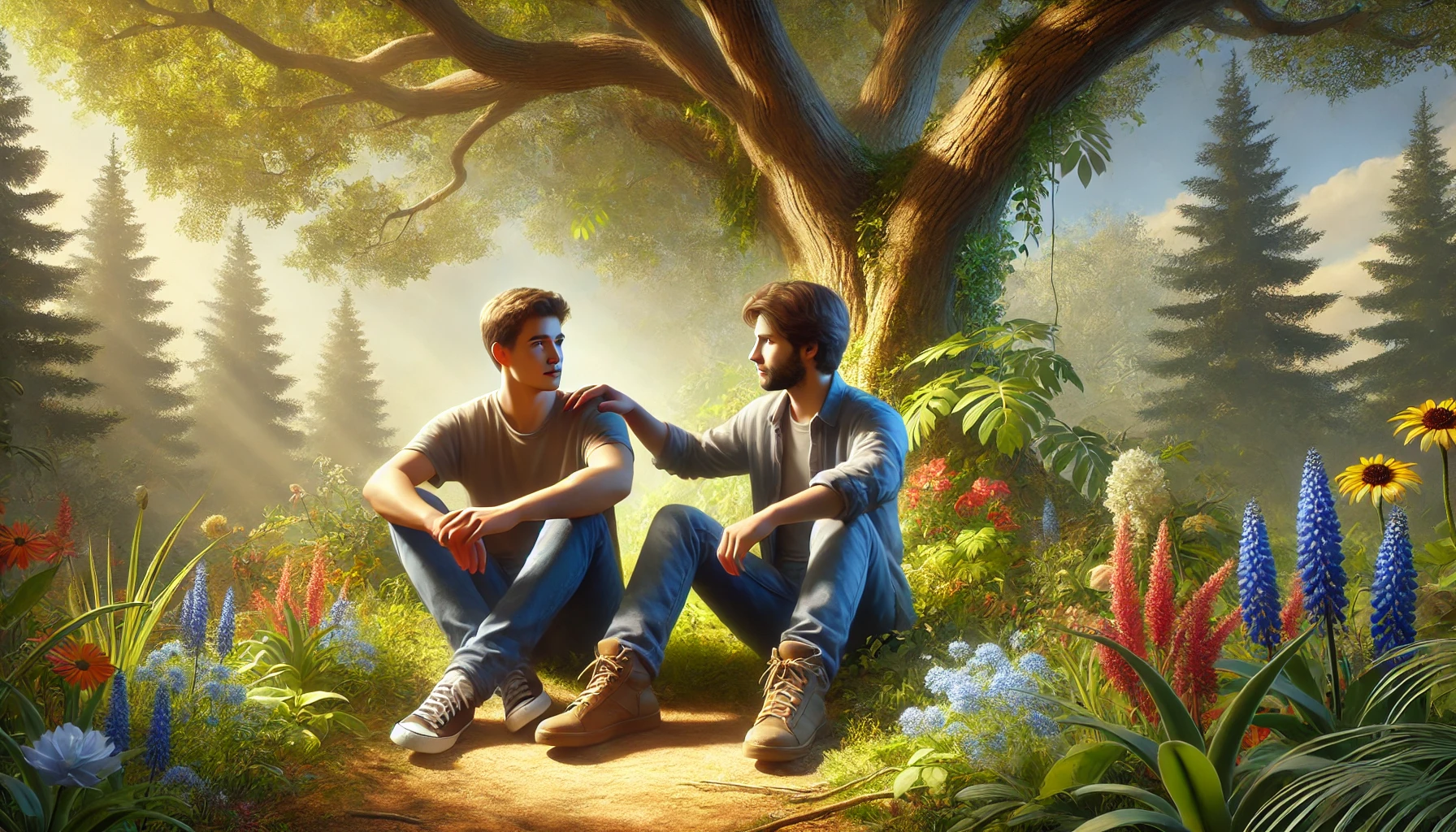 Two young men sitting on the ground in a quiet garden under a large tree.
