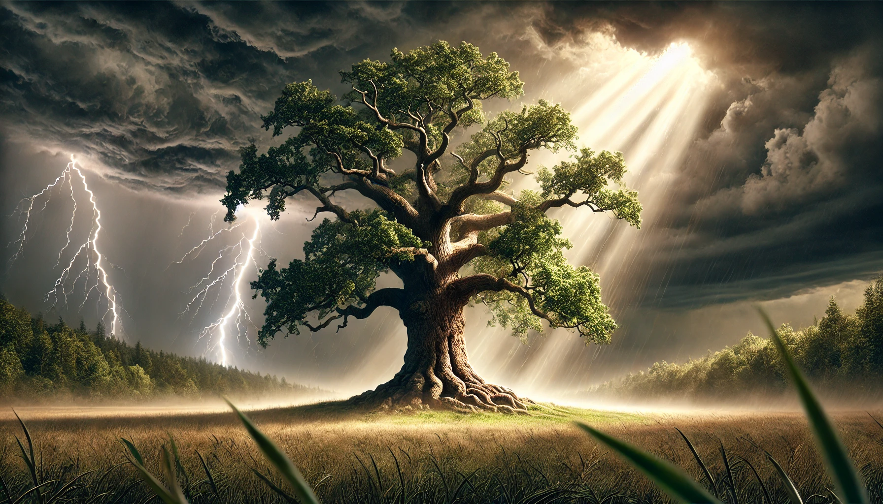 A strong, ancient oak tree standing in a meadow during a storm.