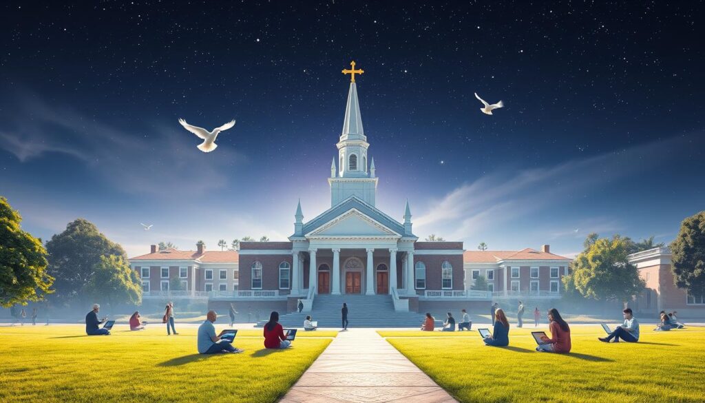 What does it mean for an online college to be Christian? It’s more than mixing faith with tech. It’s about a full experience that combines tough academics with deep spiritual values. At their core, these colleges show Christian values in how they operate, what they teach, and how they bring students and teachers together. They aim to grow students’ minds and spirits, making them faith-grounded, well-rounded people.